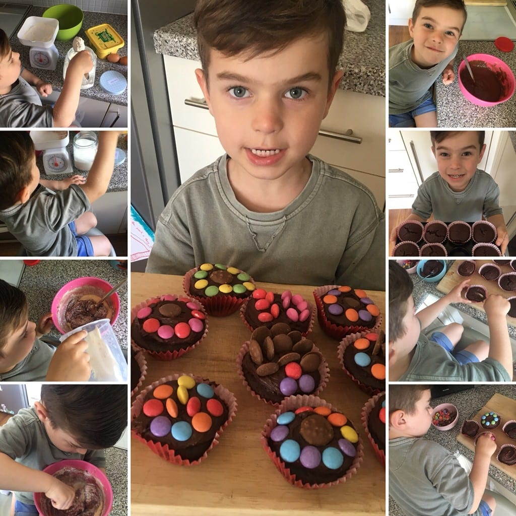 “I made them cakes for mummy’s birthday, I made patterns with chocolate buttons and smarties. It’s yummy”- Koby